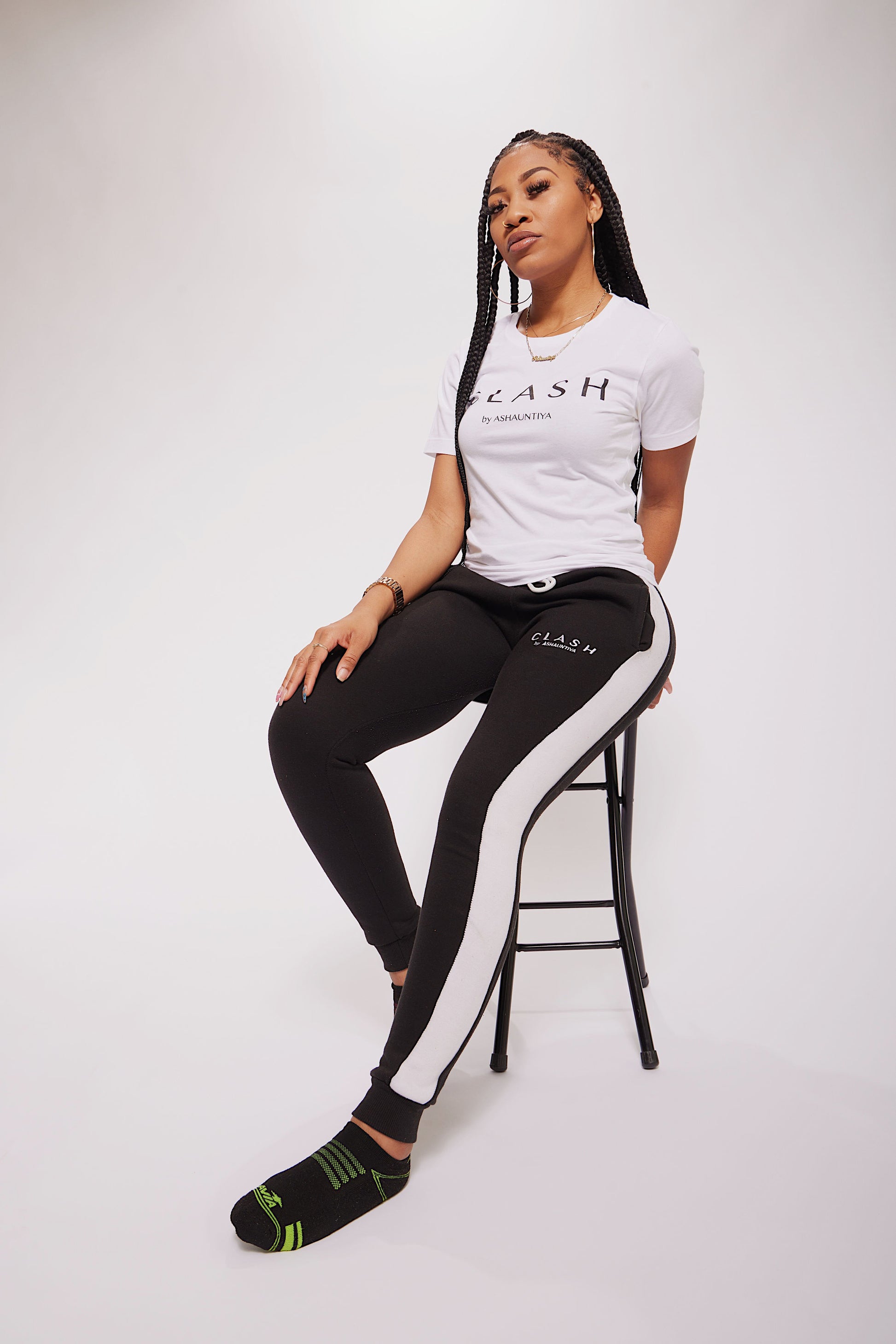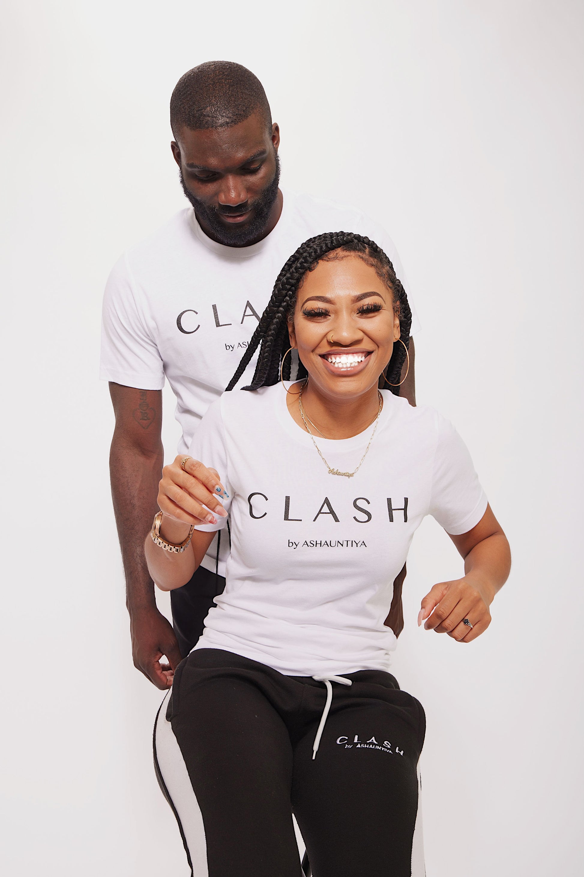 Screen printed black “CLASH by Ashauntiya” logo placed on center chest of t-shirt